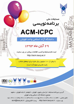 مسابقه اینترنتی دانشگاه شیراز که در تاریخ 15 آبان برگزار میشود برای کسب اطلاعات بیشتر به وبگاه ACM.blog.ir مراجعه کنید.
